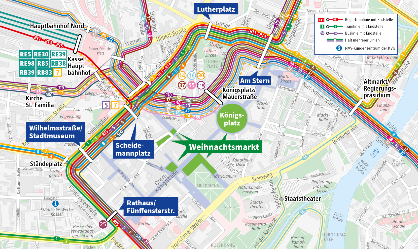 Auch in diesem Jahr gibt es aufgrund des Weihnachtsmarktes wieder Umleitungen für Trams und RegioTrams. Die geänderte Verkehrsführung gilt vom 24.11.2025 bis 30.12.2025 von 11 bis 22 Uhr.