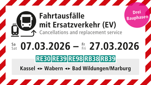 Zwischen dem 7. und dem 27. März 2026 kommt es zu Fahrtausfällen und Fahrplanänderungen auf den Linien RE30, RE39, RE98, RB38 und RB39 zwischen Kassel und Bad Wildungen bzw. Marburg. Die entfallenden Fahrten werden durch Busse im Ersatzverkehr ersetzt.