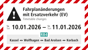 In der Nacht von Samstag, 10. Januar auf Sonntag, 11. Januar 2026 kommt es auf der Linie RegionalbahnRB4 zu Fahrplanänderungen und Ersatzverkehr (SchienenersatzverkehrEV).
