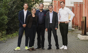 Teilnehmende und Veranstalter der Gesprächsrunde zum Thema "Wer Bus und Bahn fährt, lebt gesünder": von links Dr. Achim Schmidt (Deutsche Sporthochschule Köln), Dr. Vivian Frick (Institut für ökologische Wirtschaftsforschung), Marian Volmer (Nordhessischer VerkehrsVerbund), Prof. Dr.-Ing. Carsten Sommer (Universität Kassel) und Thorsten Bauer (Barmer). Foto: Nina Skripietz/NVV