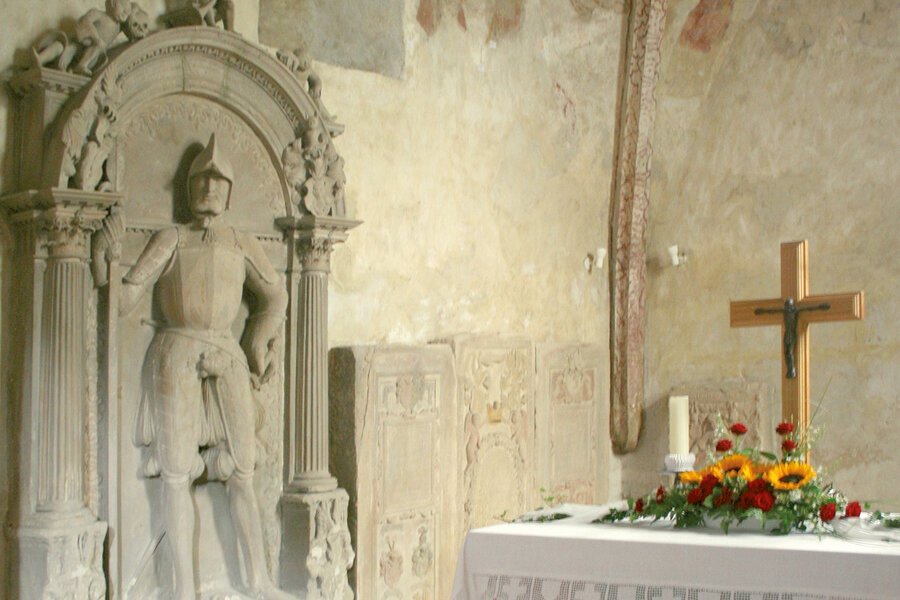 Um 1300 wurde direkt neben Schloss Augustenau die Wehrkirche erbaut. Ältester Teil der Anlage ist der mächtige Chorturm, der im Jahr 1756 seinen Fachwerkaufsatz erhielt. Das von einer hölzernen Tonne überspannte Langhaus wurde 1457 zum ersten Mal erneuert und in den Jahren 1606 und 1923 um jeweils ein weiteres Querhaus erweitert. Im Innenraum ist es von einer doppelten Empore umgeben. Der Chorraum wird von einem spitzbogigen Triumphbogen geöffnet. Besonders zu erwähnen sind die Fresken aus dem 14. Jahrhundert sowie Schrift- und Wappengrabsteine aus dem 16./17. Jahrhundert, darunter der Epitaph des Ritters Georg von Reckrodt (1558), dem Obristen des Schmalkaldischen Bundes und persönlichen Begleiter Landgraf Philipps von Hessen. Seit Ostern 2018 ist die Burgkirche auch "Radwegekirche".